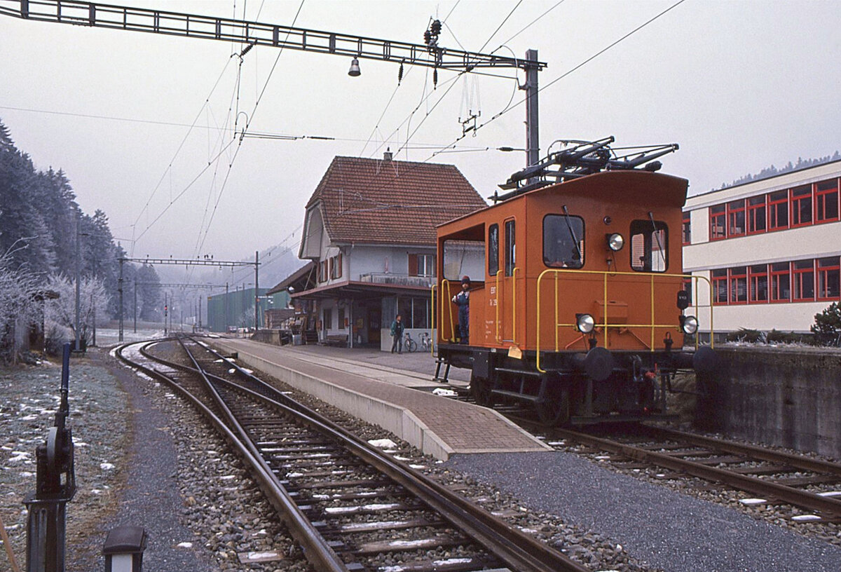 Traktoren Te I (Normalspur): Elektrische Traktoren gibt es praktisch nur in der Schweiz; im Ausland sind kleine Anschlussgeleise und Rangiergeleise nicht in so hohem Grad elektrifiziert. Die kleinen Te I sind rund 5, 6 m lang, wiegen 13 ~ 14, 5 t und erbringen 125 ~ 135 PS. Erbaut wurden sie von SLM und MFO; einige Fahrzeuge haben einen Kasten von der Fa. Tuchschmid in Frauenfeld. Die SBB erhielt zwischen 1937 und 1957 die (späteren) Nummern 1 bis 60 für den Rangierdienst und 951 – 963 für den Baudienst. Die EBT bekam 1944 – 1955 die Loks 21-29, die VHB noch 1963 die Nr. 61. Die BLS erhielt 1950/54 die Loks 11-17, bei denen dann die Westinghouse Luftbremse durch eine Oerlikon-Anhängerbremse ersetzt wurde. - Bild: Te I 57 in Glovelier, 3.Januar 1984
