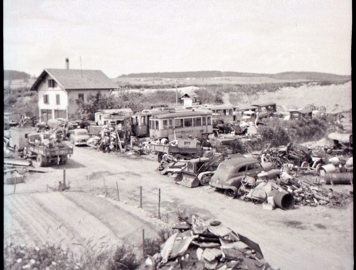 Tramway de Lausanne. Alte Tramwagen warten auf Abbruch in einer Grube bei Romont, 1964