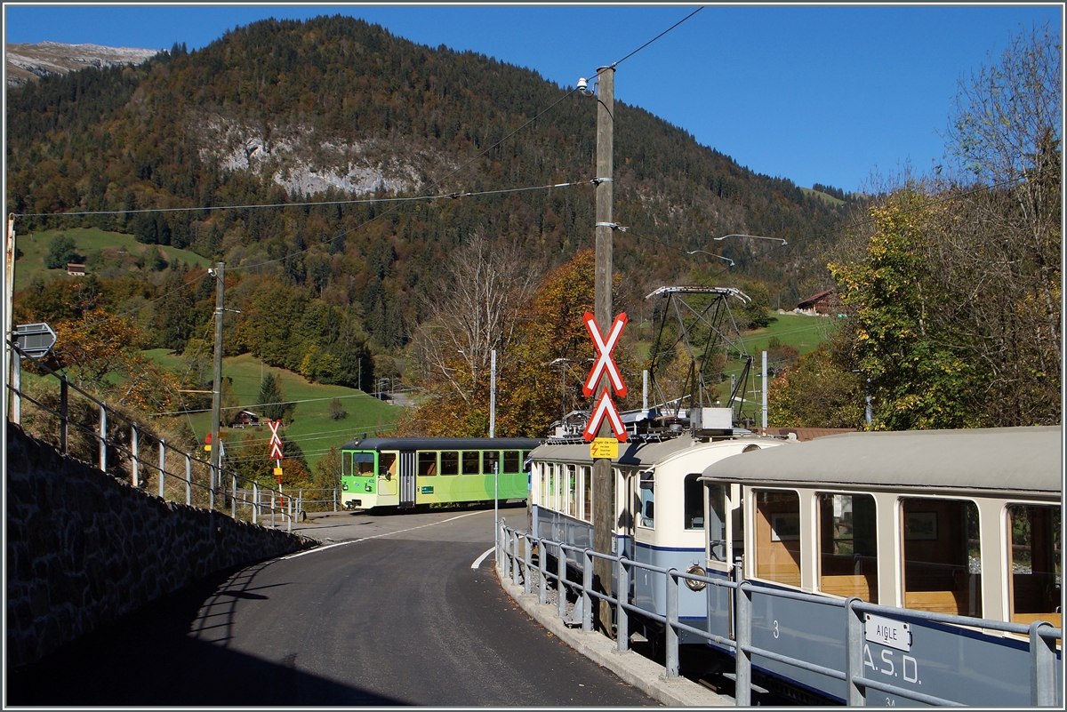 Die ASD Strecke Aigle Les Diablerets führt bis nach Les Sépey, wo die Züge die Fahrtrichtung wechseln und dabei die Strecke vom Abzweigung Les Planches nach Le Sépey zweimal befahren. Das Bild zeigt einen ASD Extrazug Les Diablerets - Aigle kurz vor Les Planches, der dem Regelzug, welcher bereits wieder von Le Sépey zurückkommt, erst folgte und nun dessen Kreuzung abwarten muss. 18. Okt. 2014