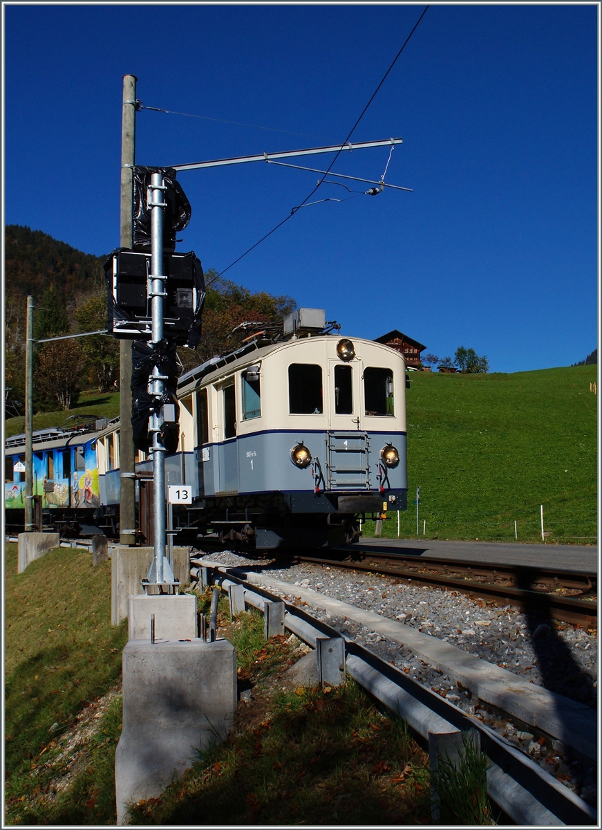 Hundert Jahre lange ging es bei der ASD ohne ortsfeste Signale, nun werden welche installiert, aber es werden noch einige Jahre ins Land ziehen, bis der Signale vom BAV genehmigt werden und endlich die Züge sicher fahren können. Der BCFe 4/4 1 und BDe 4/4 mit einem Extrazug auf der Fahrt nach Aigle bei Les Planches (Aigle) am 18. Oktober 2014