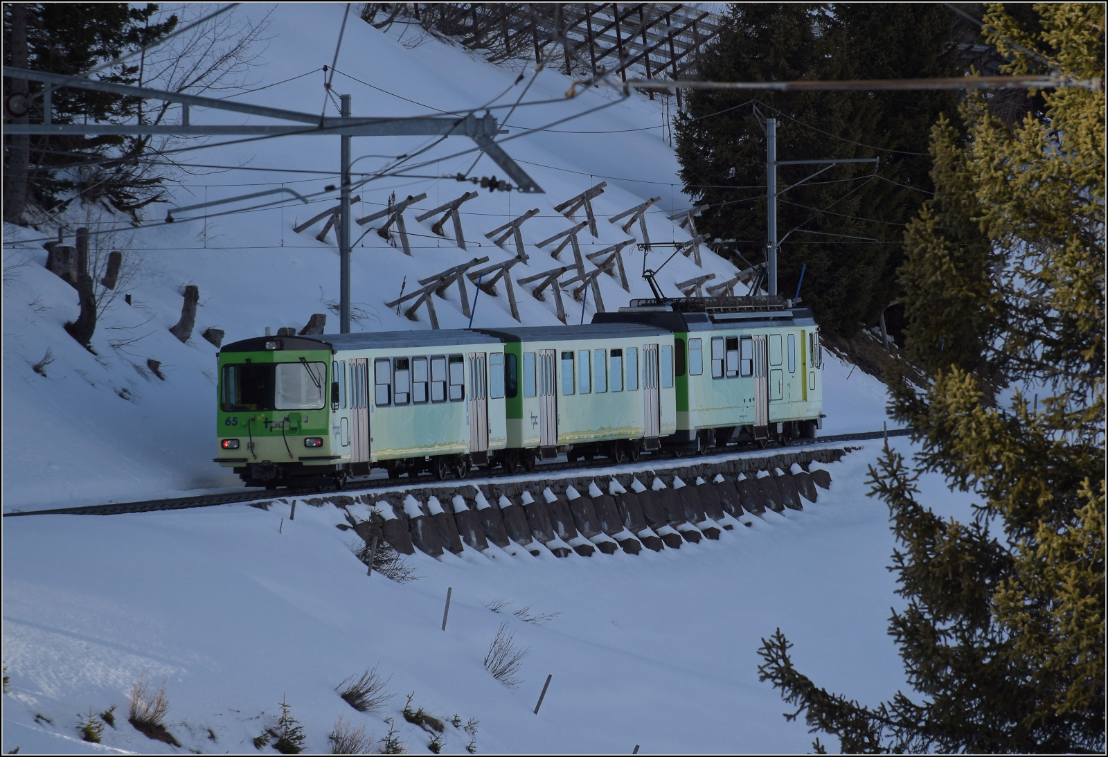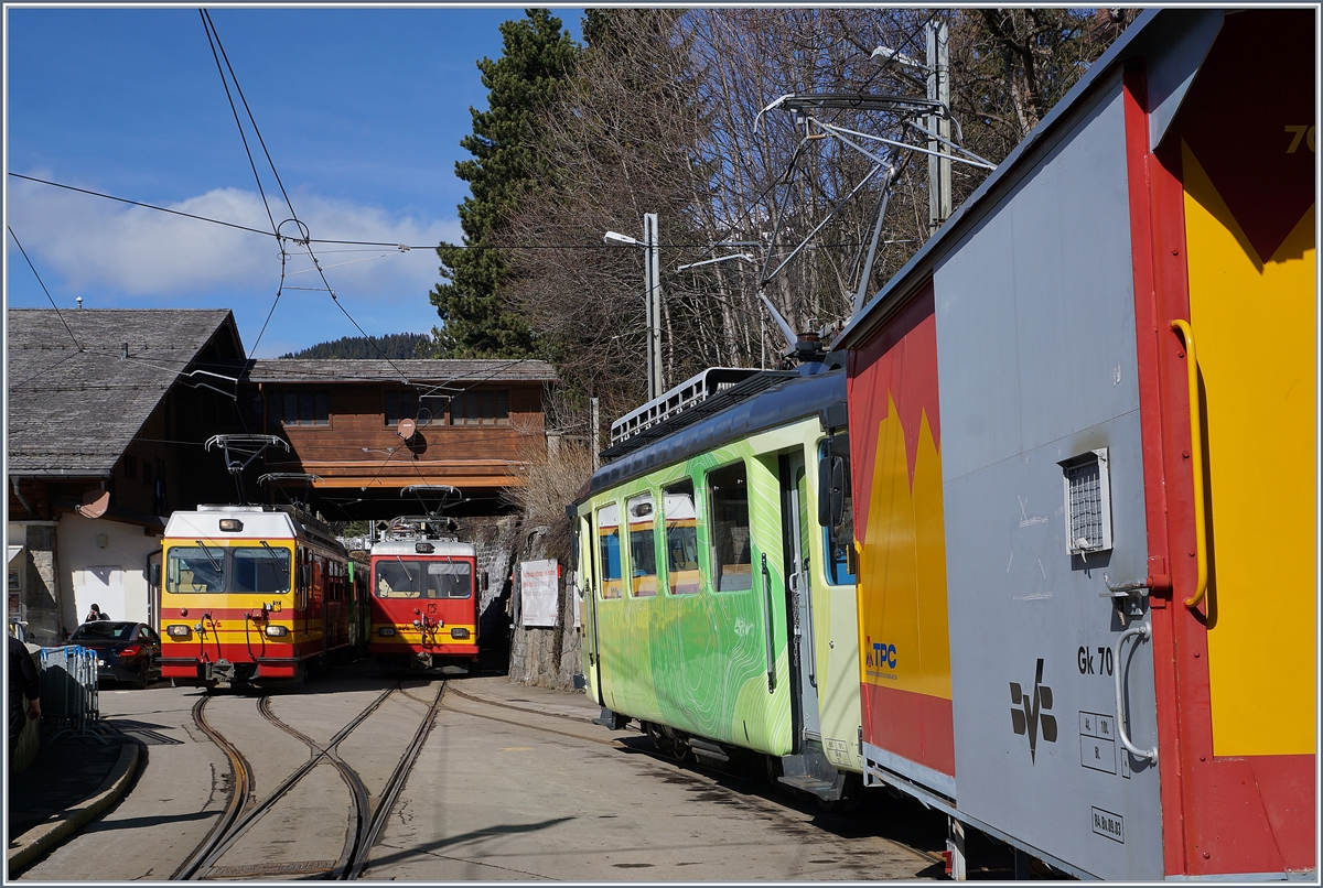 Der AL (TPC) BDeh 4/4 302 noch in der braunen AL-Farbgebung mit seinem passenden Steuerwagen überquert kurz nach der Abfahrt in Aigle den Bahnhofsplatz um dann auf der Strasse bis Aigle-Dépôt-AL Richtung Leysin zu fahren.