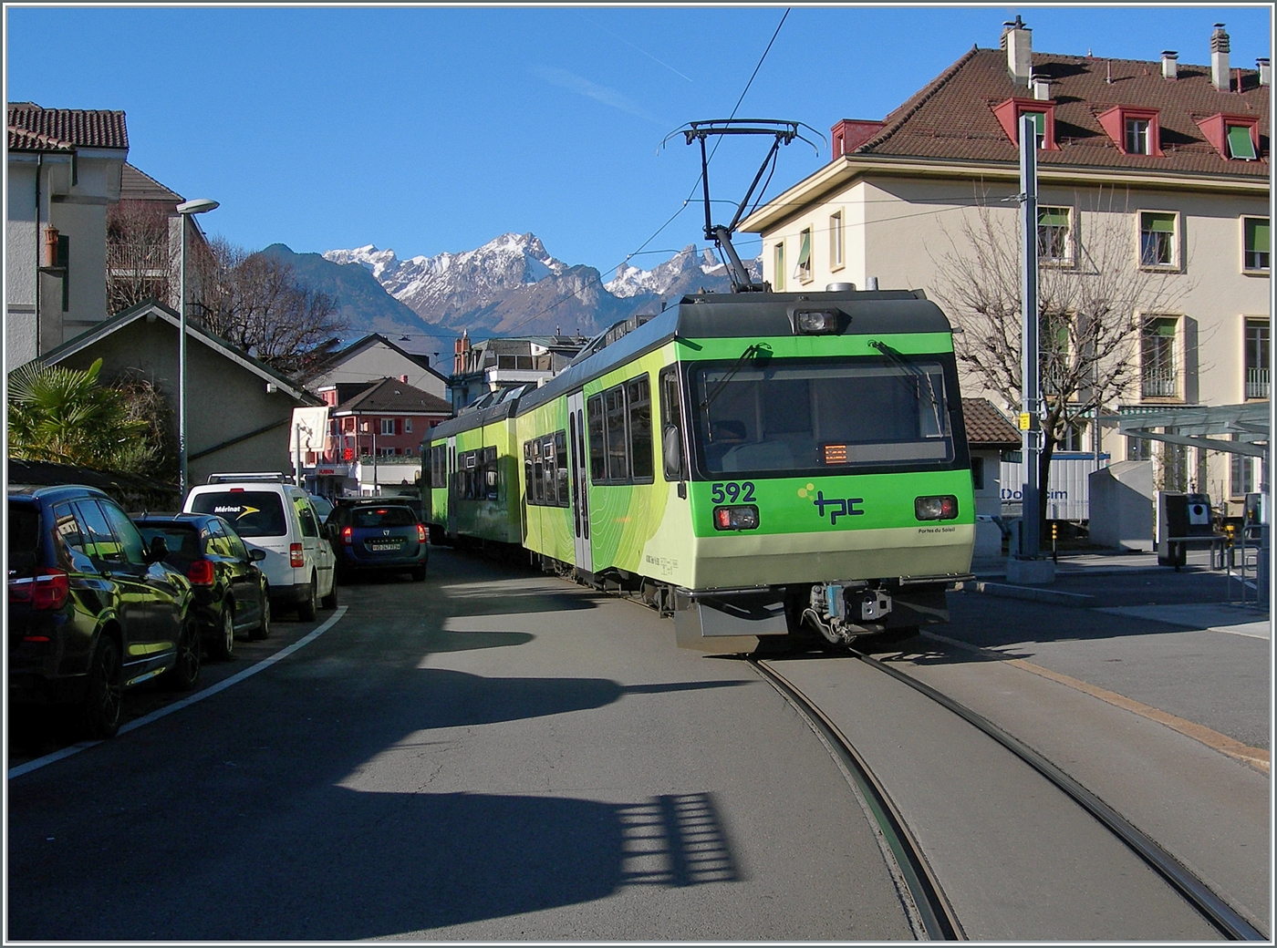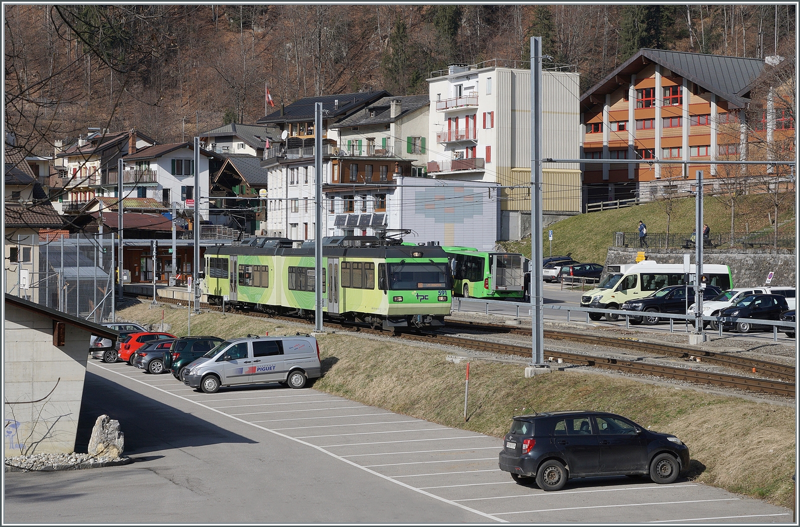 Der TPC BVB Beh 4/8 92 verlässt auf seiner Fahrt von Villars nach Bex die Station La Barboleuse, deren Gleisanlage sich grosszügig auf der Strasse verteilt hat.