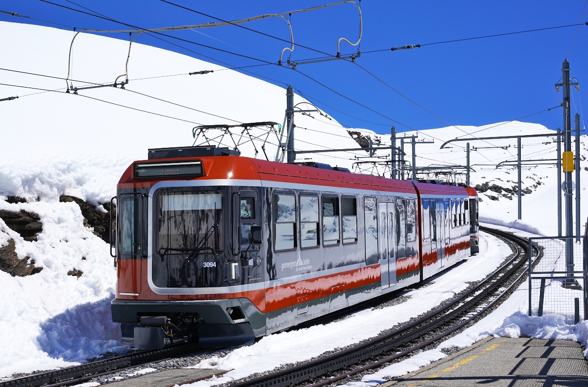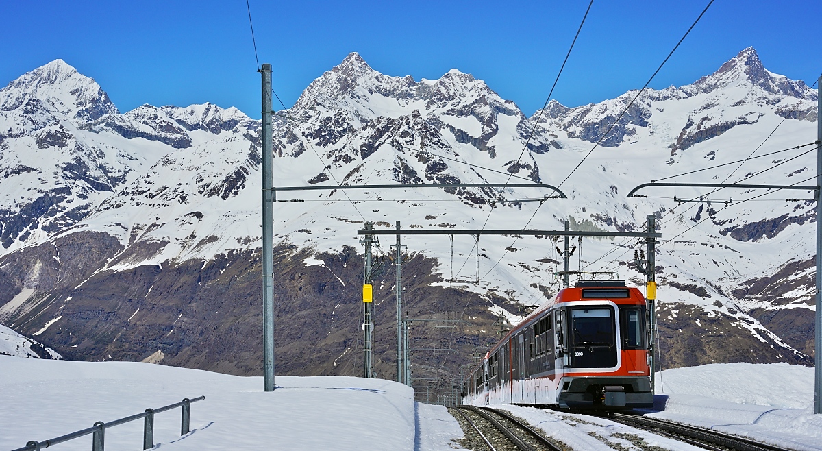 Hinab nach Zermatt fährt am 10.05.2024 ein Bhe 4/6-Doppel der Gornergratbahn, zweites Fahrzeug ist der Beh 4/6 3093, aus der Station Rotenboden, im Hintergrund die Spitzen der drei Viertausender Dent Blanche (4357 m), Obergabelhorn (4073 m) und Zinalrothorn (4221 m)
