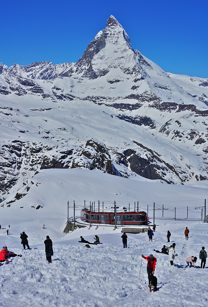 Bei traumhaften Wetter zog es am 10.05.2024 zahlreiche Ausflügler auf den Gornergrat. Im Hintergrund fährt ein Bhe 4/6-Doppel der Gornergratbahn hinunter nach Zermatt.