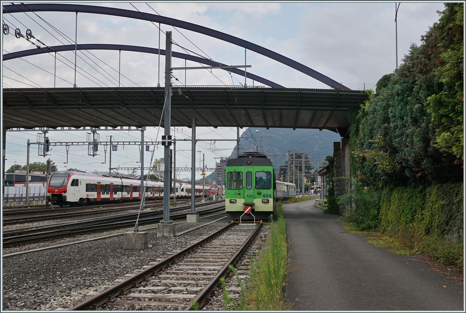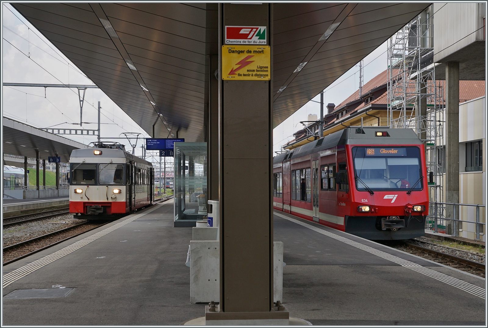Ein alter ABDe 4/4 trifft in St Cergue im Herbst 1985 auf einen neuen Triebwagen bzw. Steuerwagen. Okt. 1985