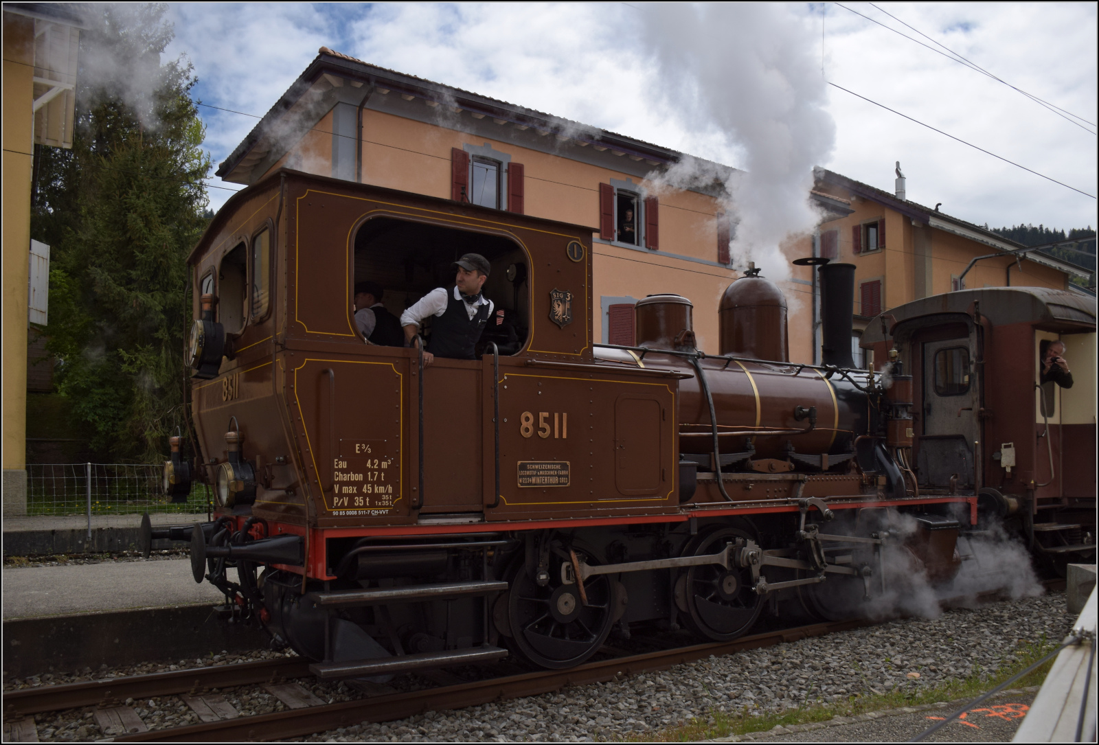 Train du Terroir. Vor dem Streckenumbau noch eine Besichtigungstour im Val Travers. Die E 3/3 5811 in Couvet. Mai 2024. Bei den ersten sechs Bildern bitte ich um Entschuldigung wegen einer versehentlichen starken Unterbelichtung, deren Behebung eine weniger gute Qualität bedingen. Ich fand sie aber trotzdem stimmungsvoll genug...