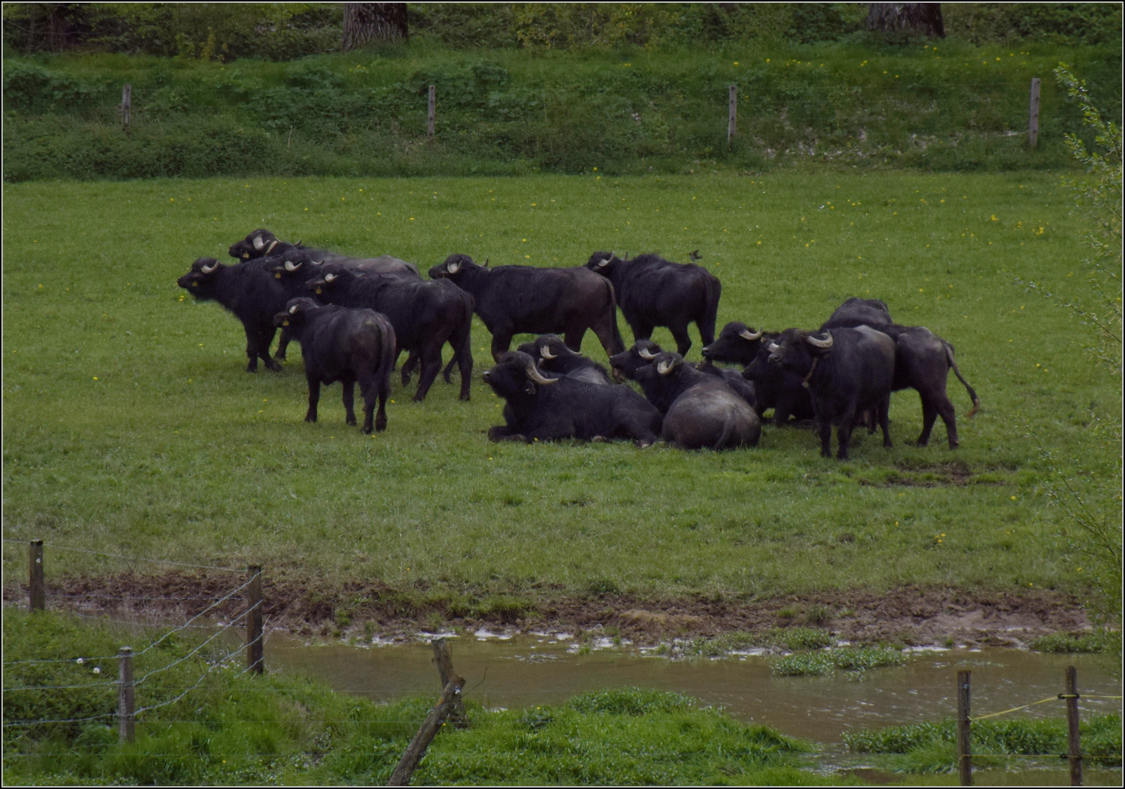 Train du Terroir. Echte Dampflok-Bewunderer kleiden sich offenbar in Schwarz, selbst wenn die Dampflok braun ist. Die Wasserbüffel gegenüber La Presta sind richtige Fans, obwohl der Zug einen halben Kilometer entfernt vorbeifährt, manchmal wird auch zügig an eine bessere Aussichtsposition gewechselt. Mai 2024.