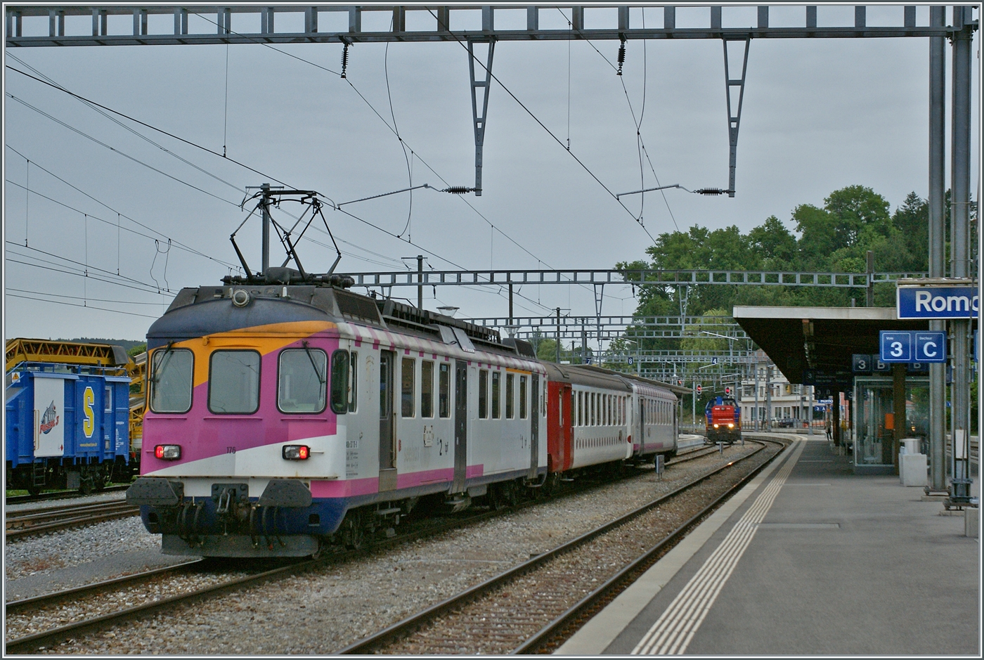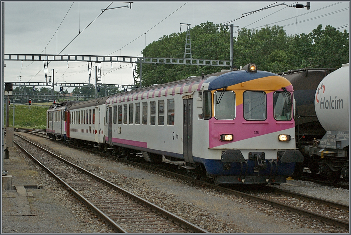 Die TPF (ex DR) Ae 4/4 (417 192-2) erreicht mit ihrem Regionalzug von Romont kommend den Bahnhof von Bulle.