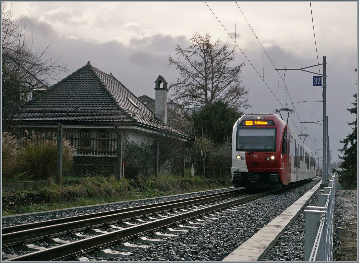 Der TPF Be 4/4 121 mit dem B 207 (ex MOB), B209 (ex MOB) und dem ABt 221 ist kurz nach Lessoc entlang des Stausees Lac de Lessoc als RER 51 nach Montbovon unterwegs.