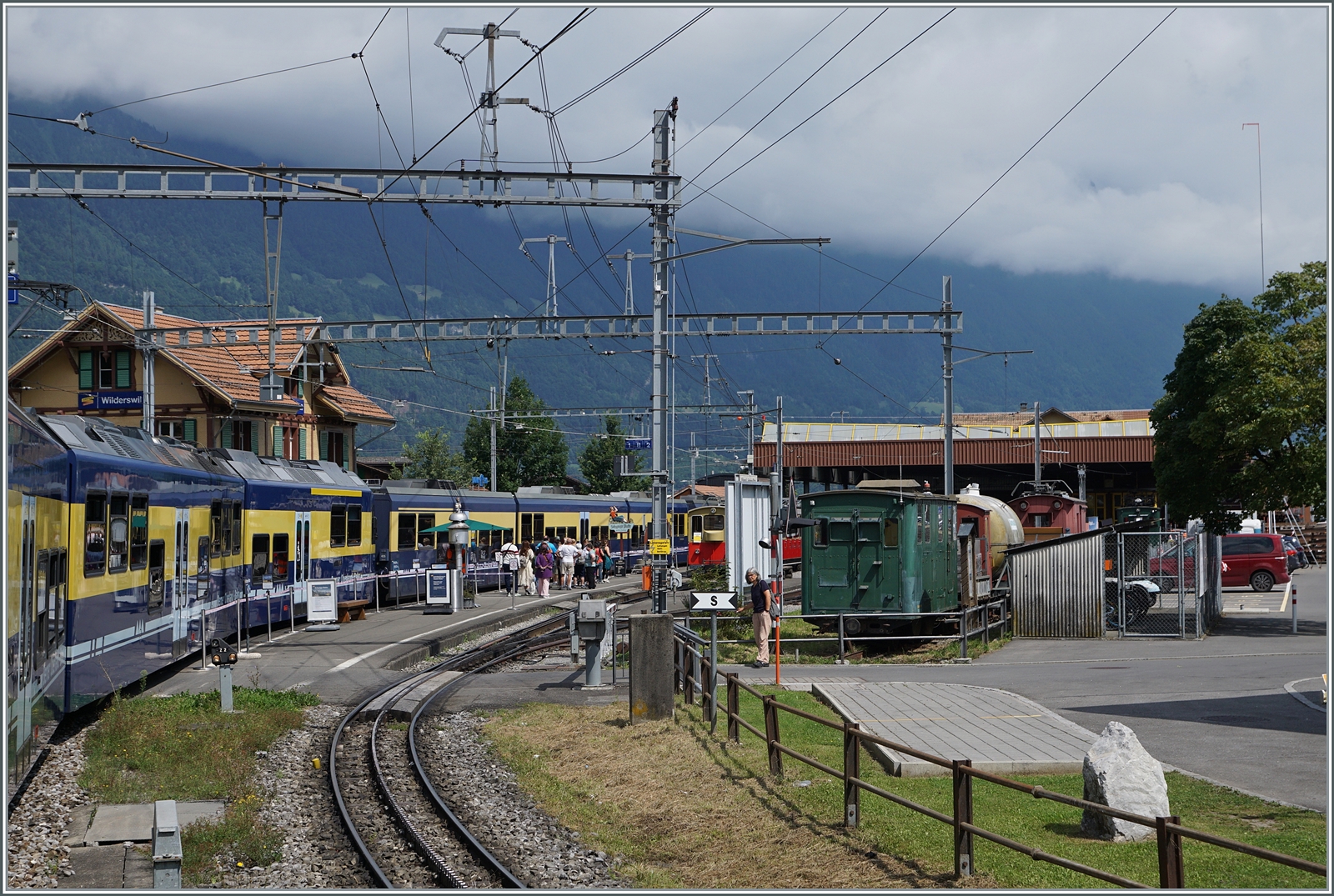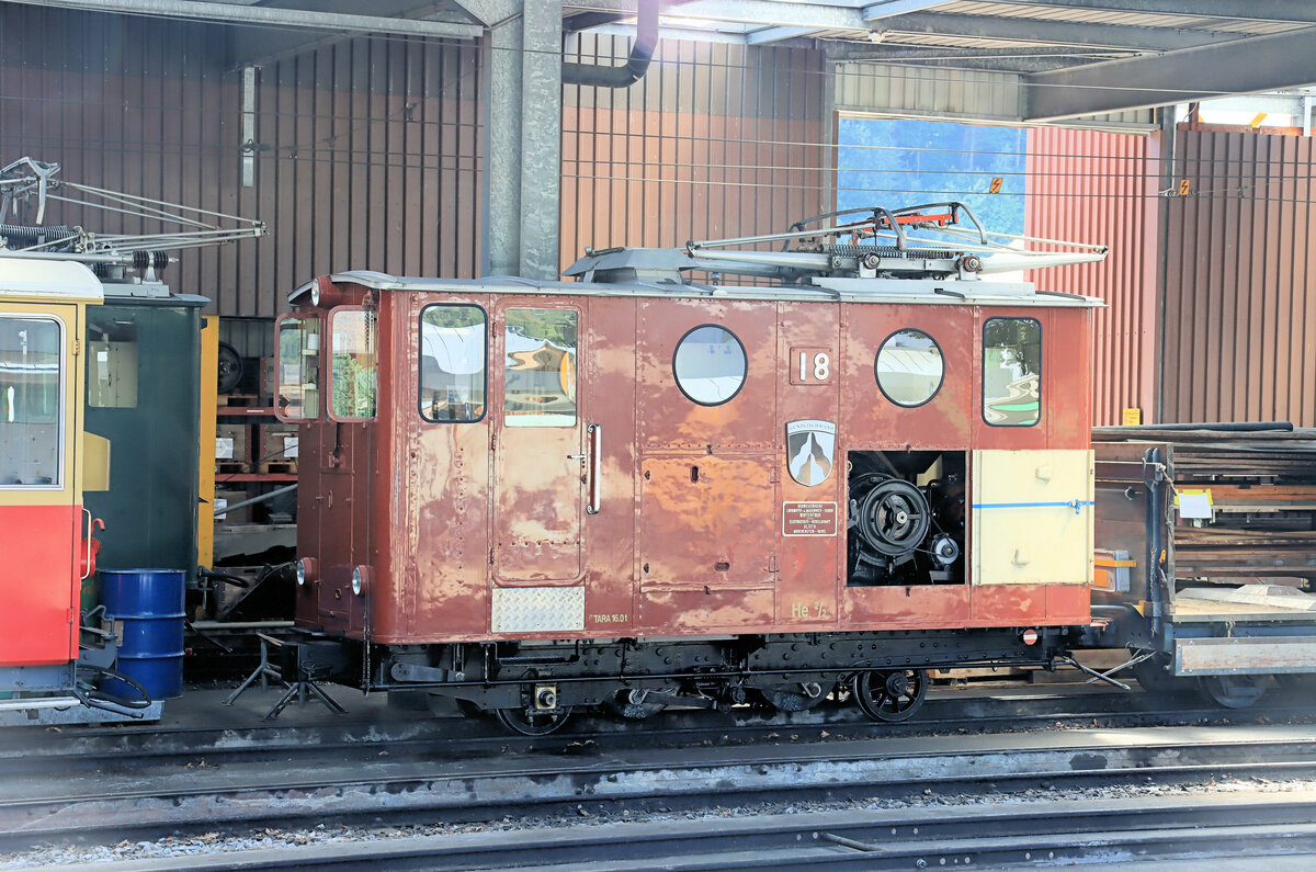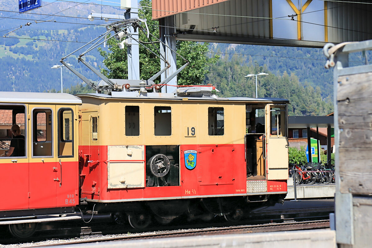 An einem sonnigen Tag im Juni 1990 stehen He 2/2 12 und zwei weitere He 2/2 in der Bergstation der Schynige Platte-Bahn