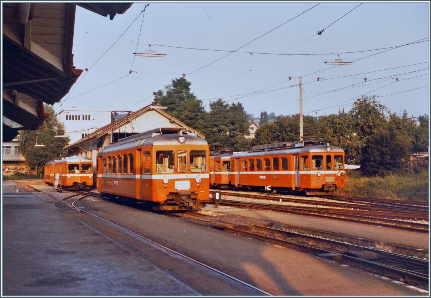 Der WSB De 4/4 steht mit einem aufgebockten Gklm und einem Gs als Güterzug 550 in Menziken Burg und wartet auf die Abfahrt nach Suhr.