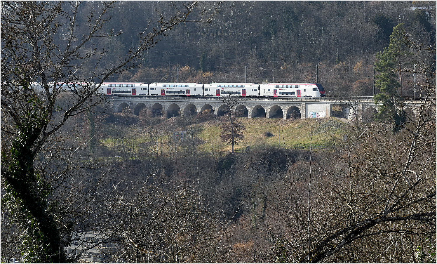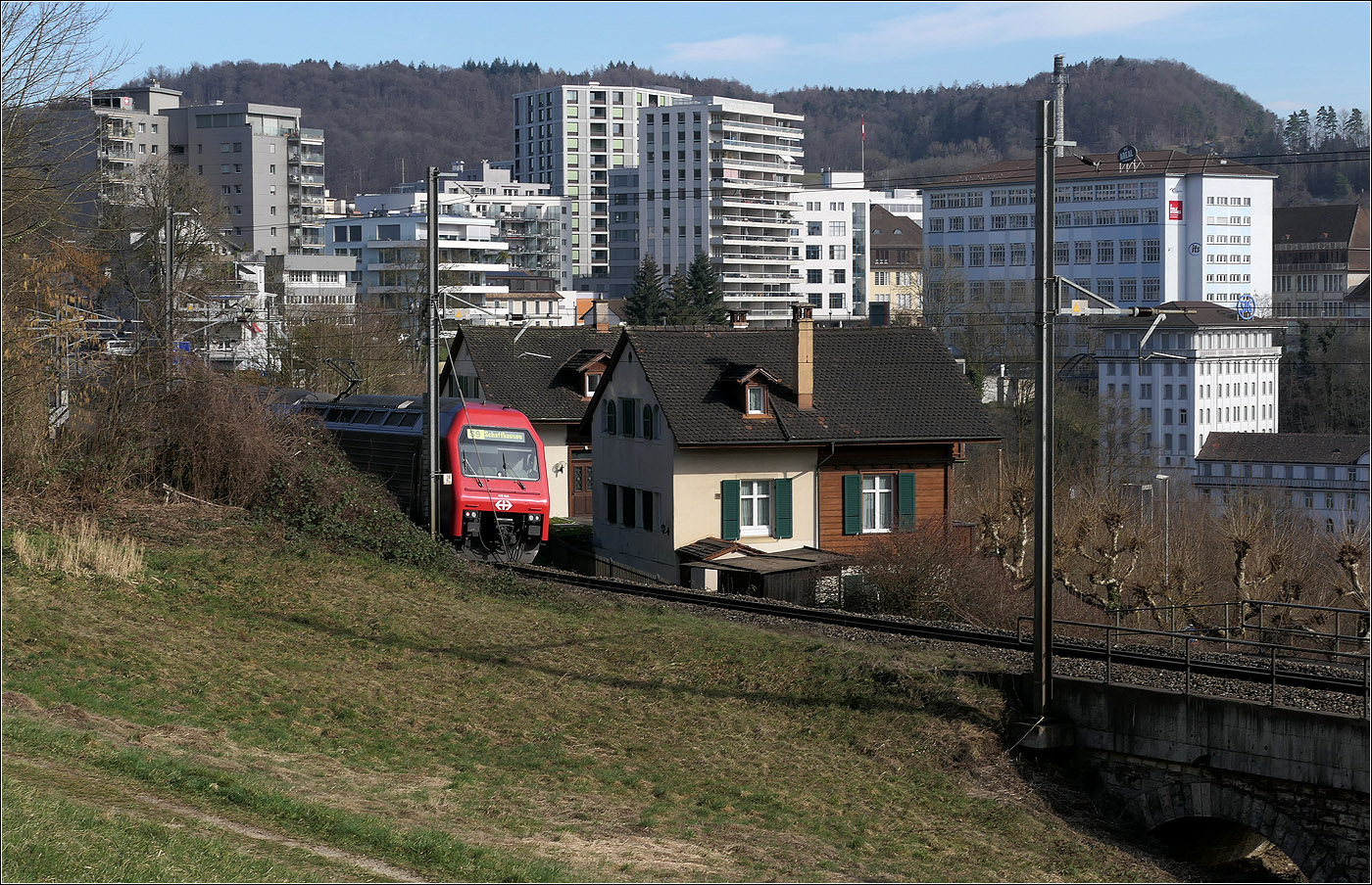Eine Re 450 mit einer S9 bei der neuen Haltestelle Neuhausen Rheinfall.