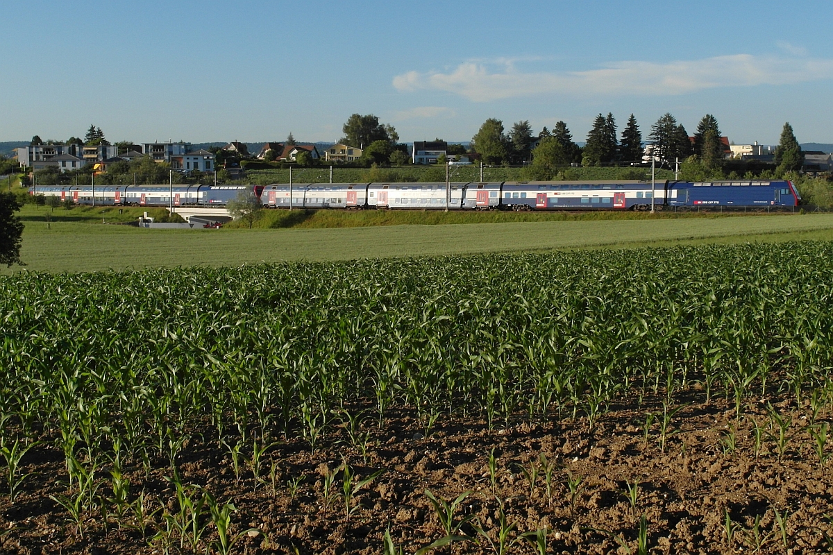MThB: MThB Ae 477, ehemals DR BR 142 mit einem Güterzug mit Personenbeförderung (GmP) bei Kehlhof im August 1995. Bei den Personenwagen handelt es sich um aufgearbeitete ausrangierte Mitteleinstiegwagen der SBB.