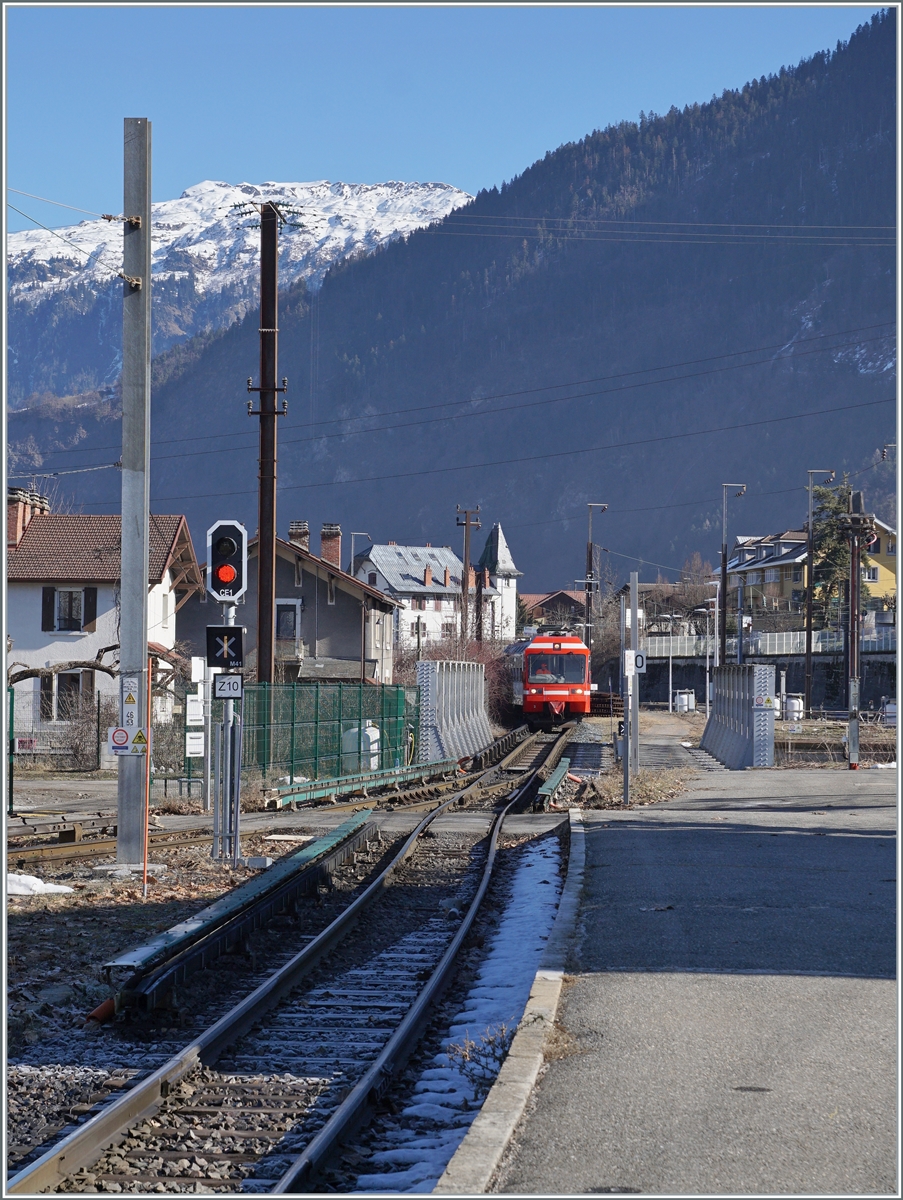 Der TMR Beh 4/8 71 erreicht als Regionalzug 26220 von Martigny kommend sein Ziel Vallorcine. Rechts im Bild das Ausfahrtsignal C 110 welches von der Form und Nummerierung her überraschend schweizerischem Standard entspricht, während links im Bild die Weiche einen typischen SNCF Handweichenmechanismus aufweist.