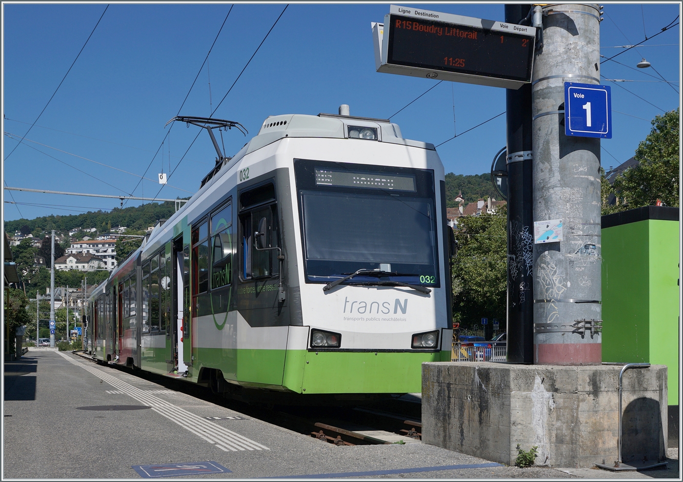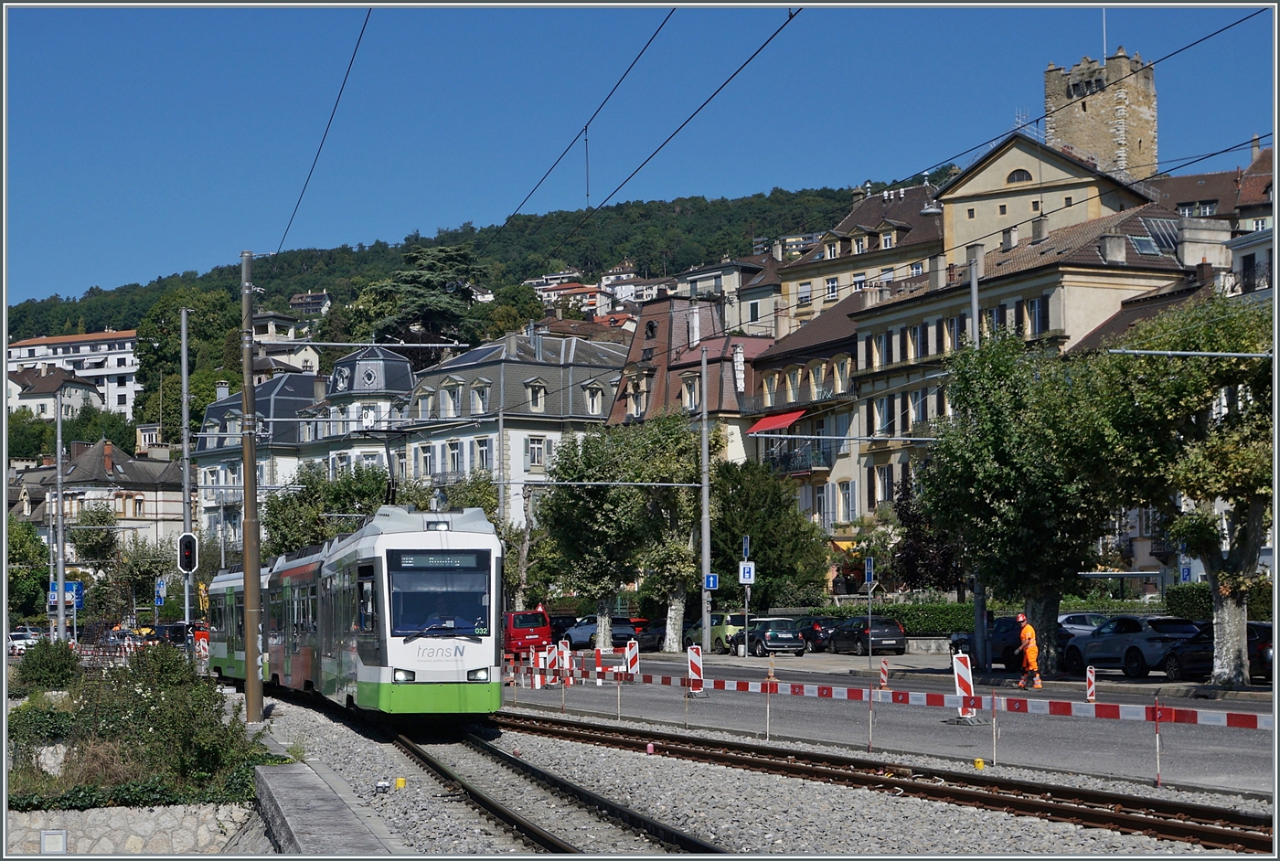 Nach einer kurzen Wendezeit in Neuchâtel Place Pury Littorail wird der TransN Be 4/8 32 als Regionalzug R 15 5680 wieder nach Boudry Littorail zurückfahren. 7. August 2025