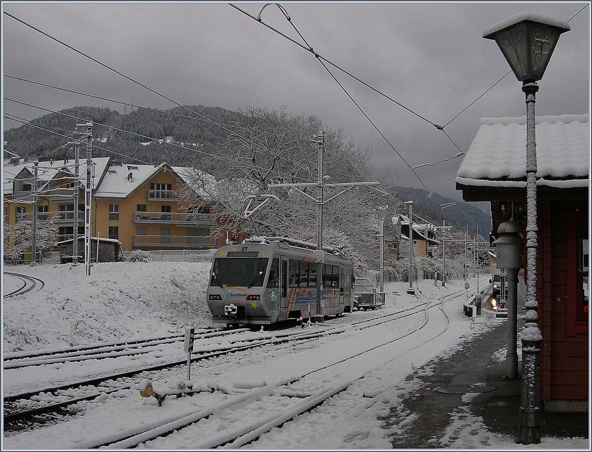 Winter in Blonay: Während ein CEV GTW 2/6 auf die Abfahrt nach Vevey wartet, sind der Train des Etoiles und ein A7 mit Bt für die Fahrt Richtung Les Pléiades vorgesehen.