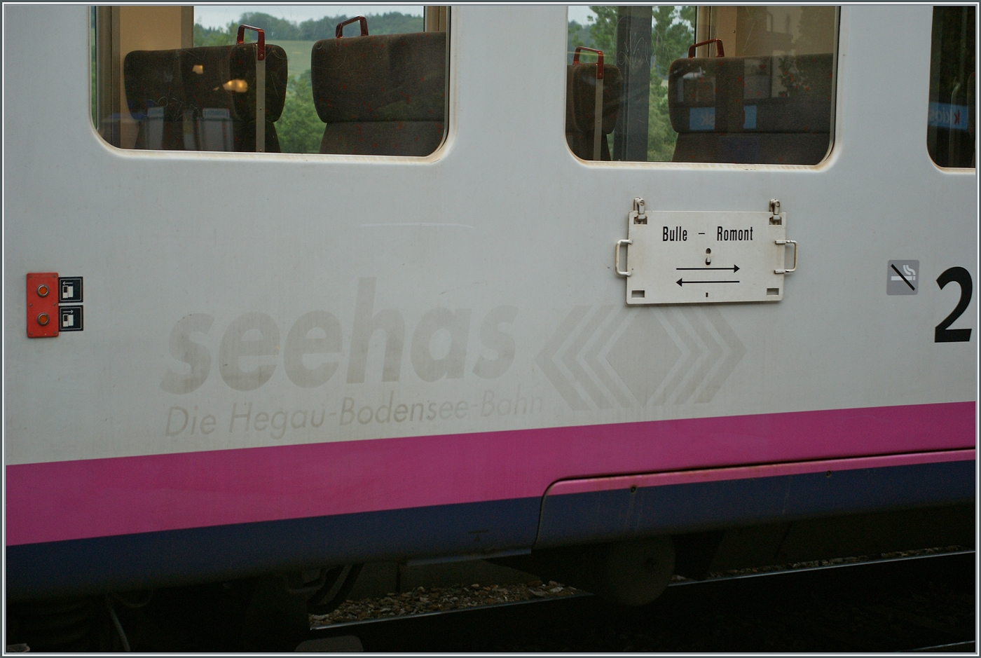 Der TPF Regionalzug in den ex MThB Farbgebung (mit Ausnahme des TPF Mittelwagens) von Bulle kommend am Ziel der Fahrt in Romont angekommen.