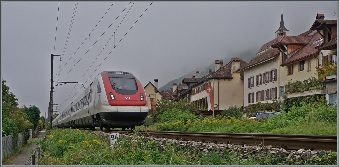 Dass es sich lohnt in Concise auszusteigen vermittelt auch dieses Bild: die unmittelbare Umgebung von Concise zeigt sich sehr lieblich, zudem liegt Concise am Neuenburger See, der hier vom linken Bildrand her gesehen nur wenige Meter entfernt ist. Zwei ICN RBDe 500 sind in Concise als IC5 auf dem Weg in Richtung Biel/Bienne.