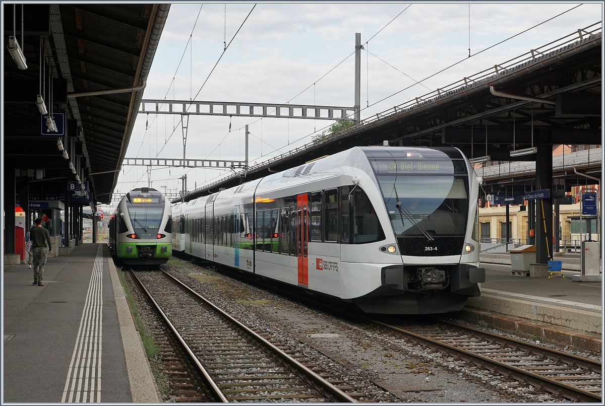 Der SBB GTW RABe 526 263 und ein weiterer warten in Biel/Bienne auf die Abfahrt in Richtung Jura, wobei in Sonceboz Sombeval "geflügelt" wird.