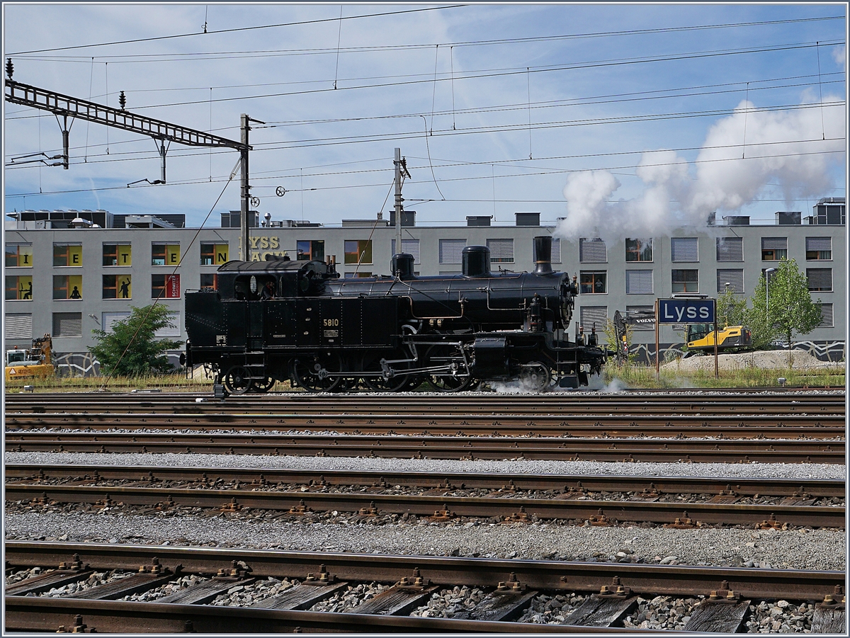 Das Bild zeigt den in Lyss ausfahrenden Zug.