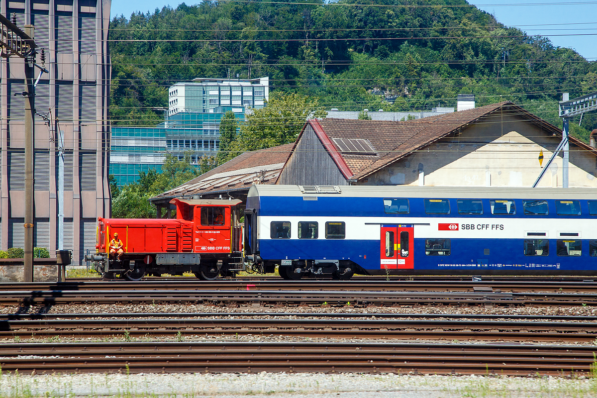 Die SBB Tmf 232 302-0 (Tmf 98 85 5 232 302-0 CH-SBB) rangiert am 11.07.2022 einige Personenwagen beim Bahnhof Olten (Aufnahme aus einem Zug durch die Scheibe).